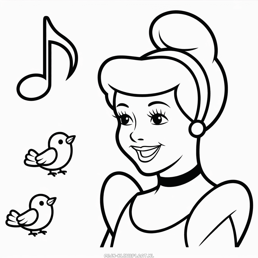Gratis kleurplaat van Assepoester en vogels, een charmante scène waarin Assepoester omringd is door vriendelijke vogeltjes. Print en kleur deze betoverende tekening van Assepoester en haar gevederde vrienden voor kinderen. Hoogwaardige PNG-afbeelding in zwart-wit, geoptimaliseerd voor afdrukken op A4-formaat in PDF.
